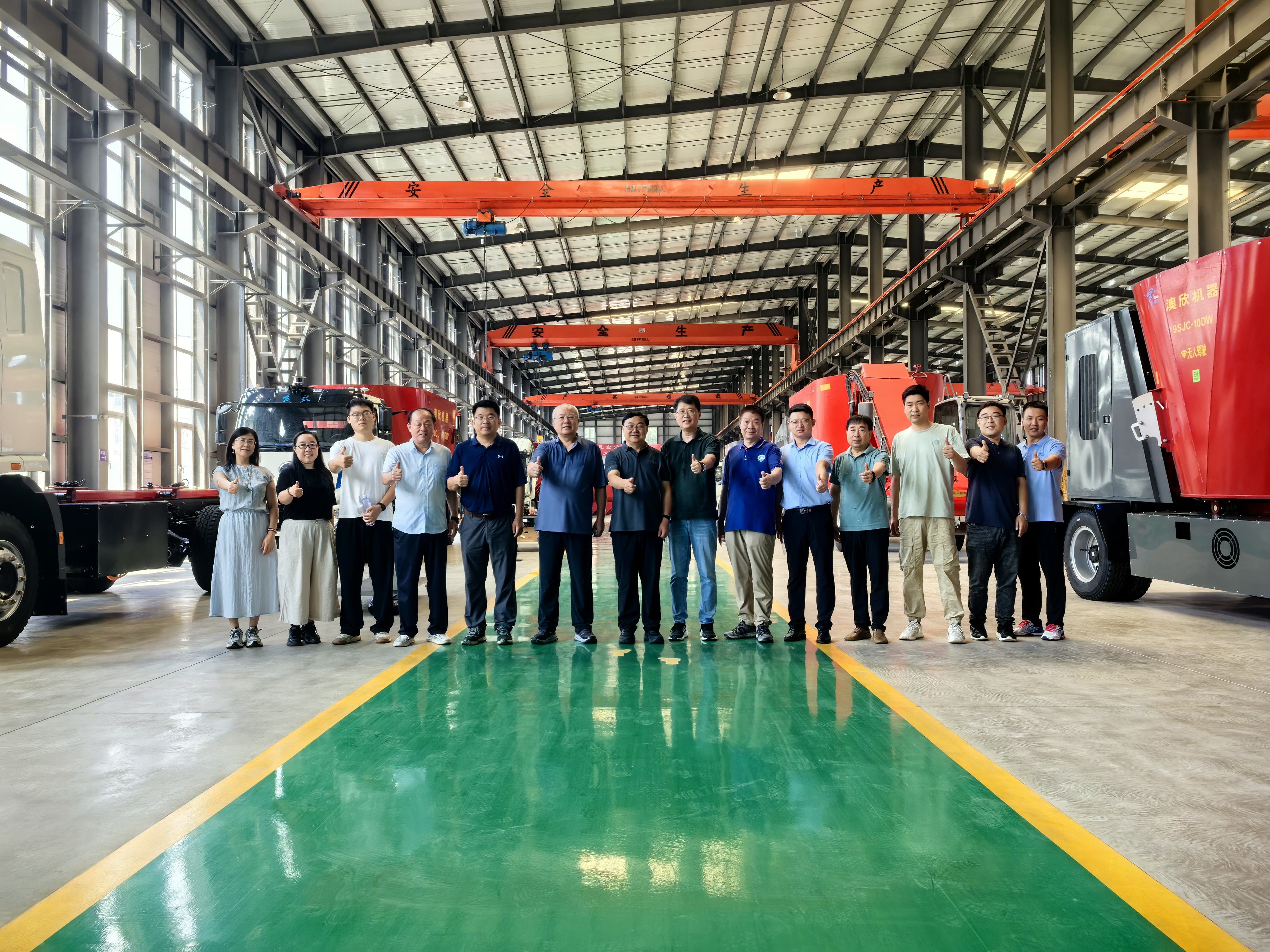 專家團(tuán)隊(duì)先后參觀了澳欣公司TMR制備機(jī)、燃油動(dòng)力撒料車及自走式TMR、電動(dòng)無人駕駛?cè)隽宪嚰败囕d式TMR、飼喂控制系統(tǒng)等設(shè)備生產(chǎn)車間和現(xiàn)場(chǎng)。